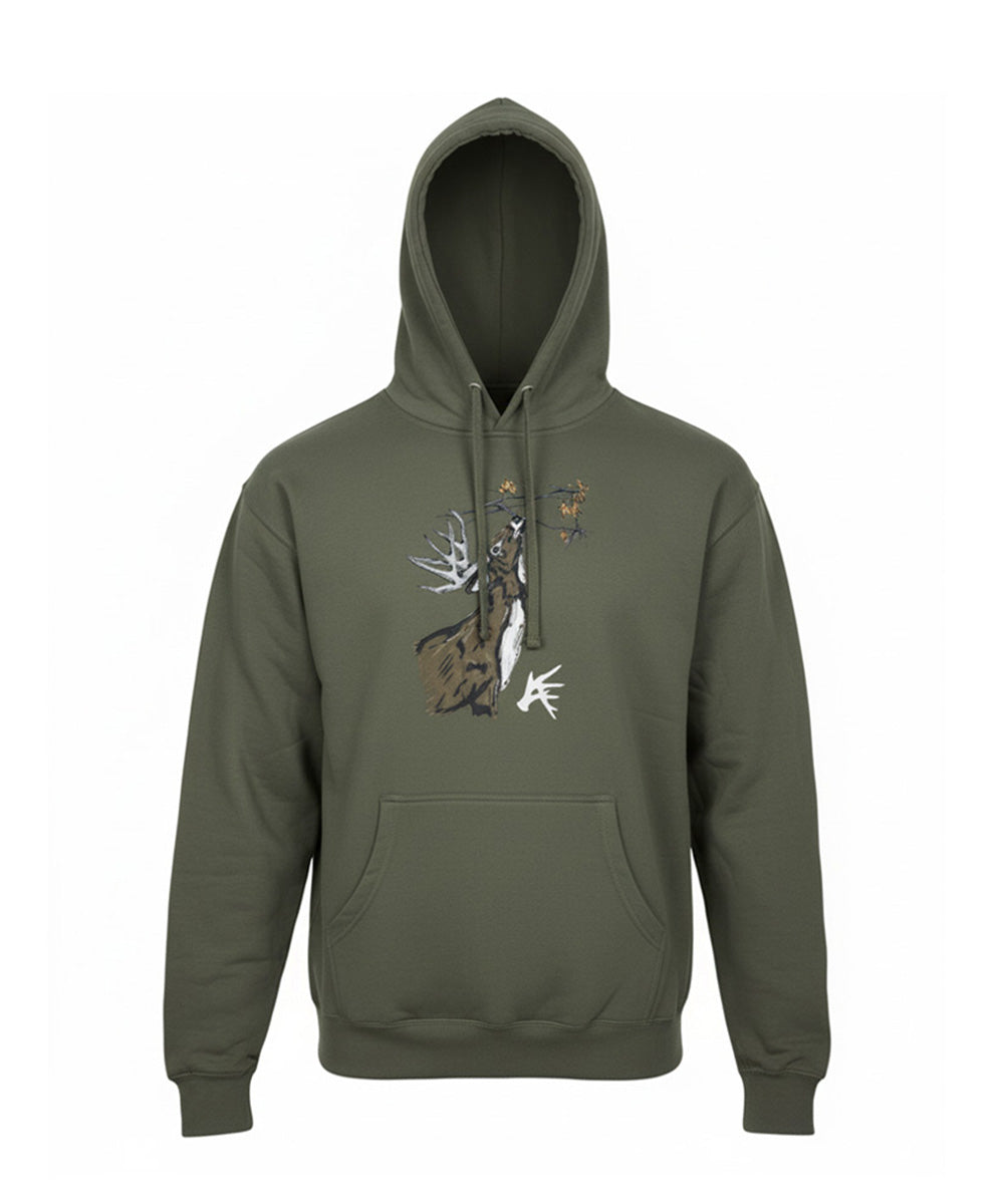 This Buck Scrape Hoody features a truly unique design, making it a great choice for the Hunting enthusiast. Made from a cotton-polyester blend fleece, this hoody is both comfy and warm, making it ideal for all-day wear. Plus, you can trust its high-quality construction which proudly displays a big buck making a scrape on the front.