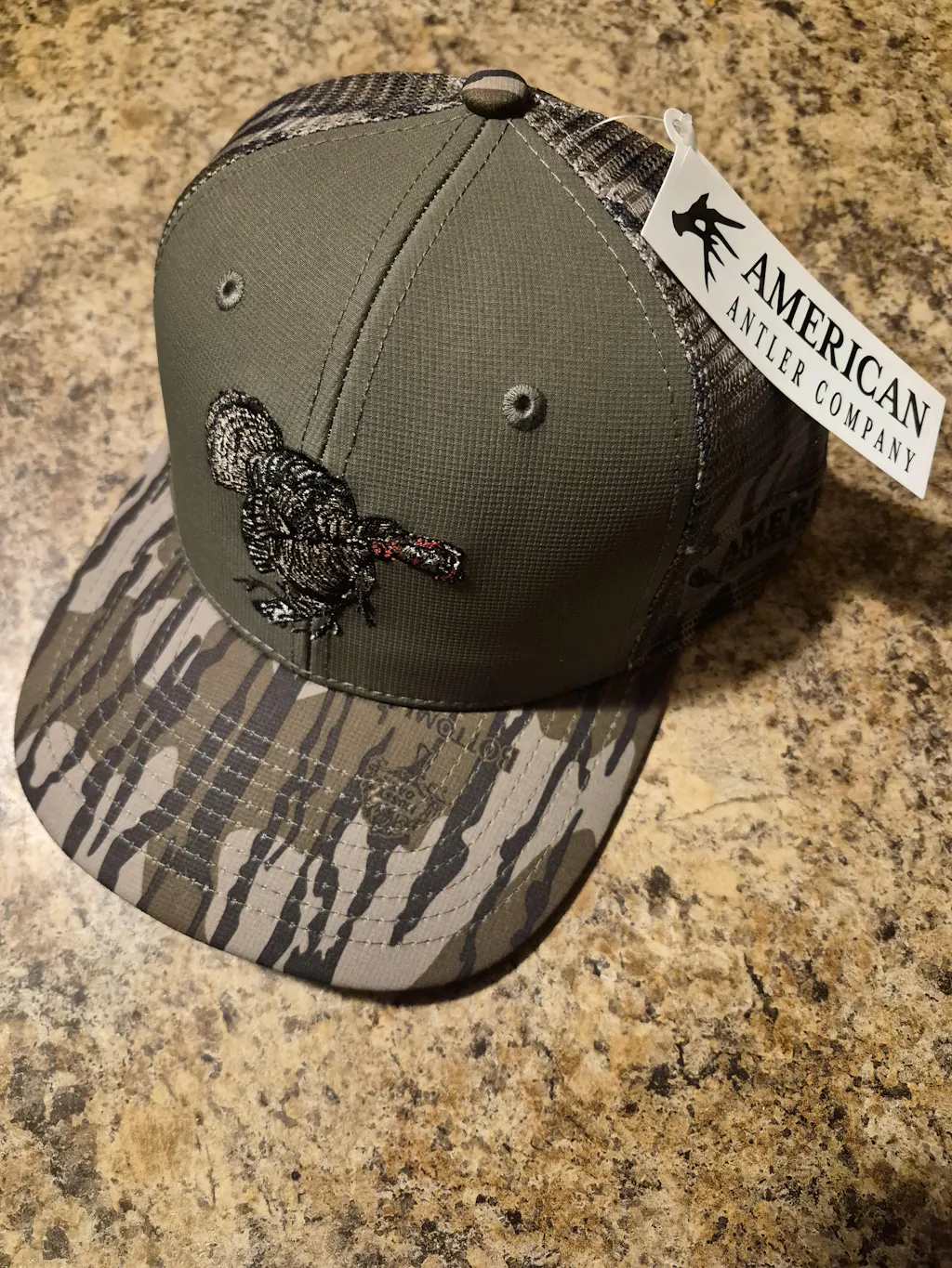 Introducing the Roosted Gobbler Bottomland Snapback in olive green, featuring original Mossy Oak Bottomland land camo mesh and bill. Made with rip stop performance material and a comfort performance sweatband, this hat offers all-day comfort while showcasing a unique Roosted Gobbler art.
