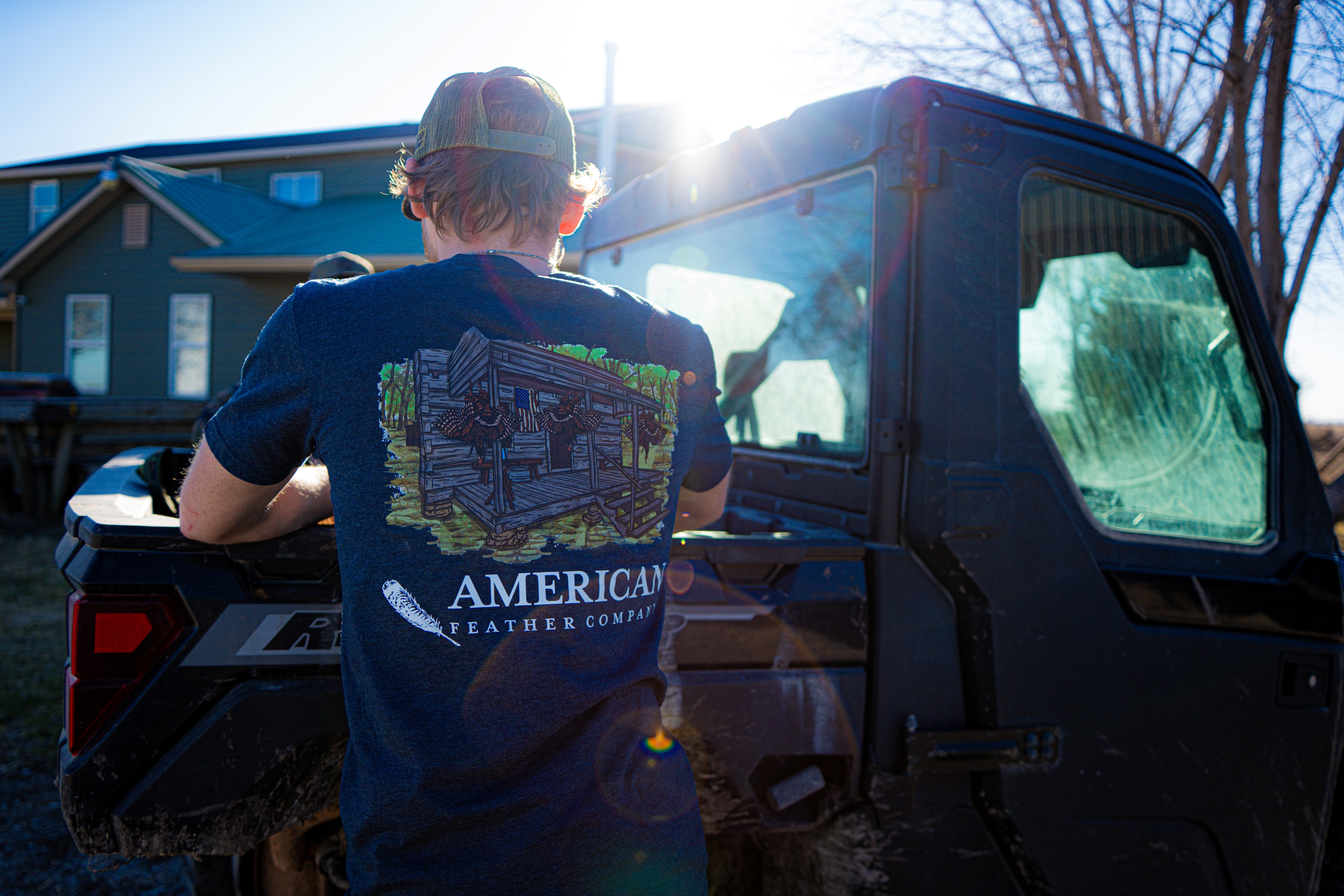 The Turkey Camp Tee offers all-day comfort and softness with its blend of 60% polyester and 40% cotton. Its unique artwork captures the essence of a successful day at turkey camp. Perfect for those who value comfort and style while celebrating their love for turkey hunting.